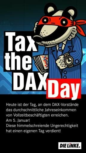 Heute ist der Tag, an dem DAX-Vorstände das durchschnittliche Jahreseinkommen von Vollzeitbeschäftigten erreichen. Am 5. Januar! Diese himmelschreiende Ungerechtigkeit hat einen eigenen Tag verdient, den "Tax the DAX"-Day. #dielinke #taxthedax #TaxTheRich