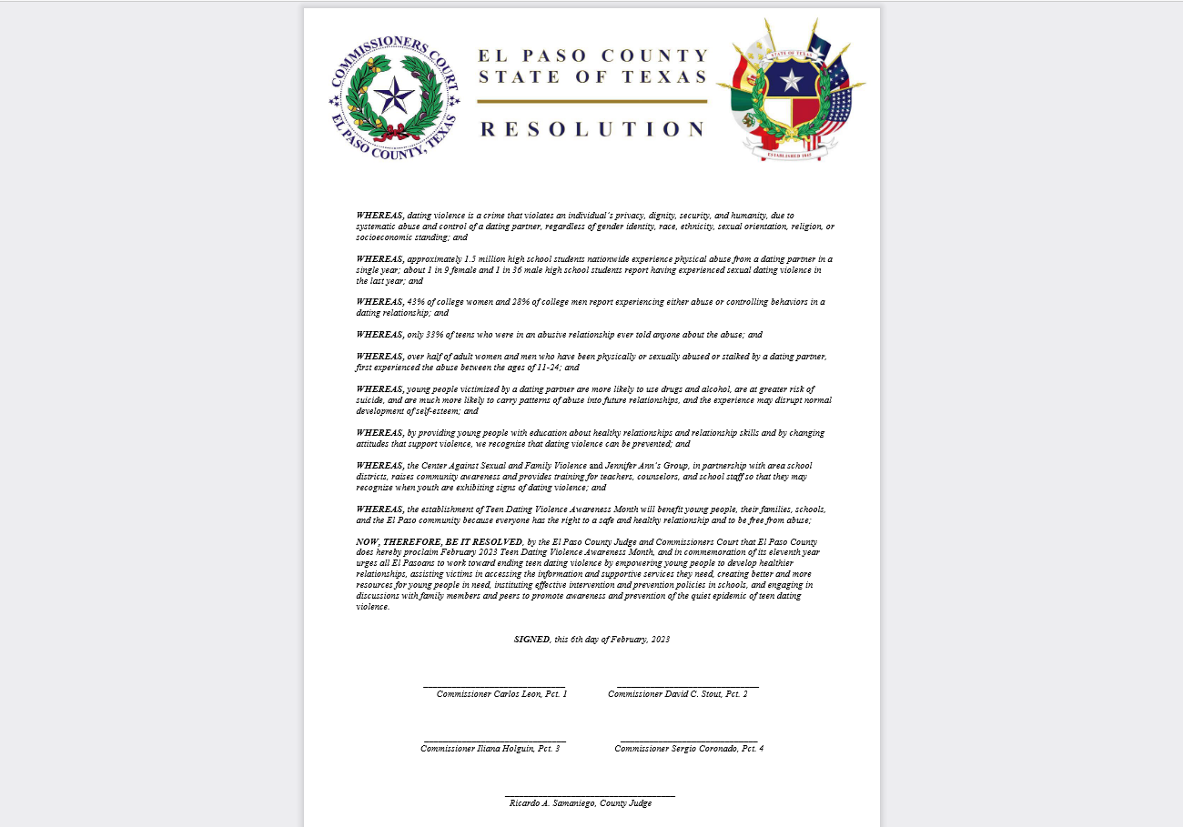 Thank you to the El Paso County Judge and Commissioners Court for their Resolution recognizing February 2023 as Teen Dating Violence Awareness Month (#TDVAM).