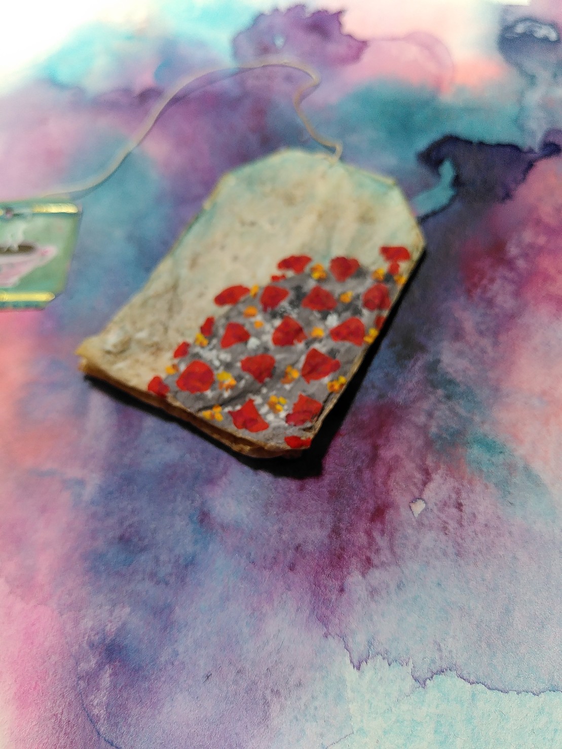 What do people paint on such a ressoucefully harvested surfac as teabags durng these difficult times? Of course a corona virus!