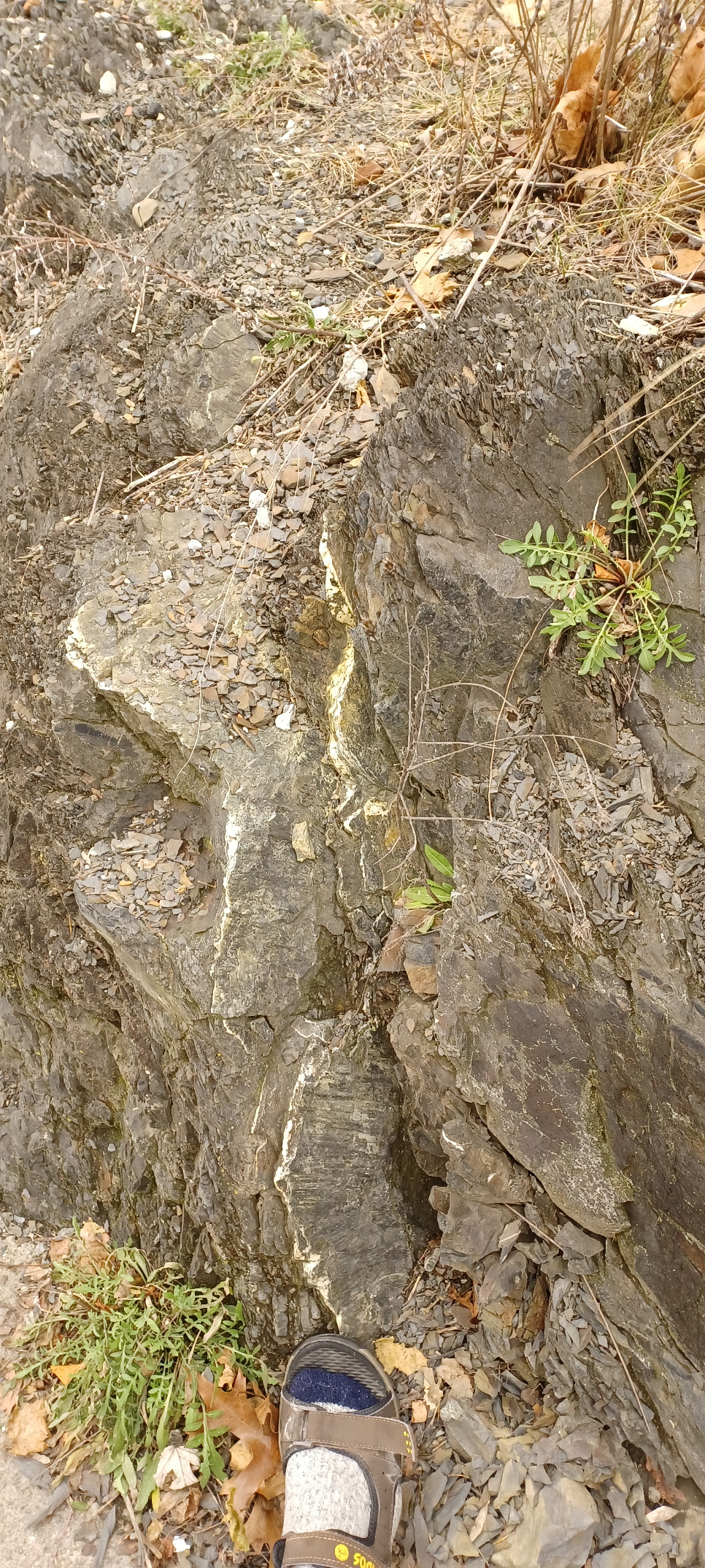 two outcrops with quartz veins that seem to be related to slickensides (bedrock cracking and two pieces slide past each other)