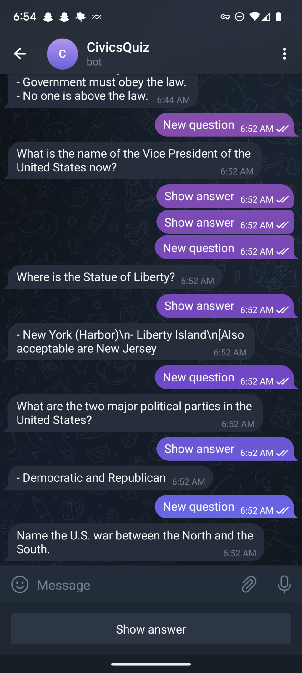 My wife has to begin studying for her US Citizenship test so to help her out, I put together a quick telegram bot that works similar to flash cards. I found building a chat bot to be so much faster than building out an entire app. Blog post coming soon with more details (probably when I'm done with the bot)