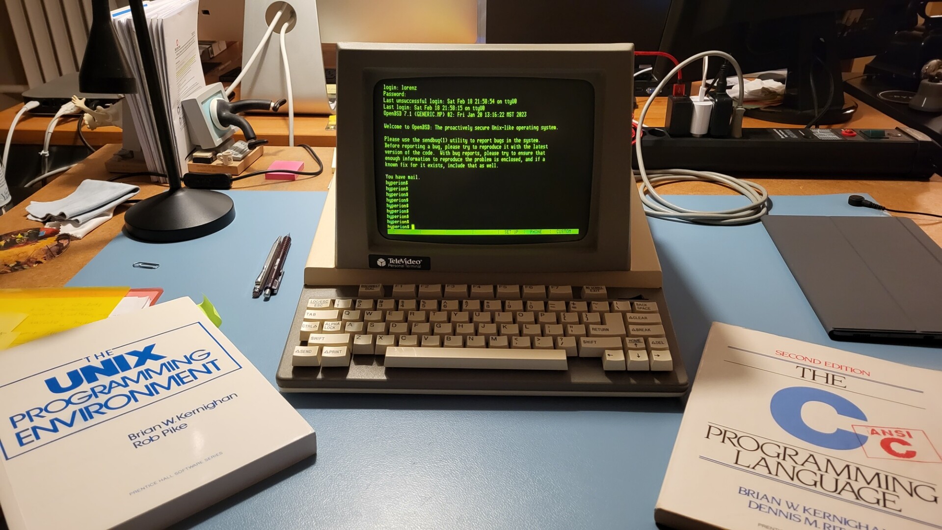Read some manual pages of #OpenBSD before going to bed. All this like in the old days in the 1980's via a serial #TeleVideo Personal Terminal on /dev/cuaU0 connected to my Lenovo ThinkPad T430 with #OpenBSD 7.1. Very cool feeling! Very cozy via the green CRT. I enjoy and love #OpenBSD! Thanks to all who contributed so much for this excellent OS.