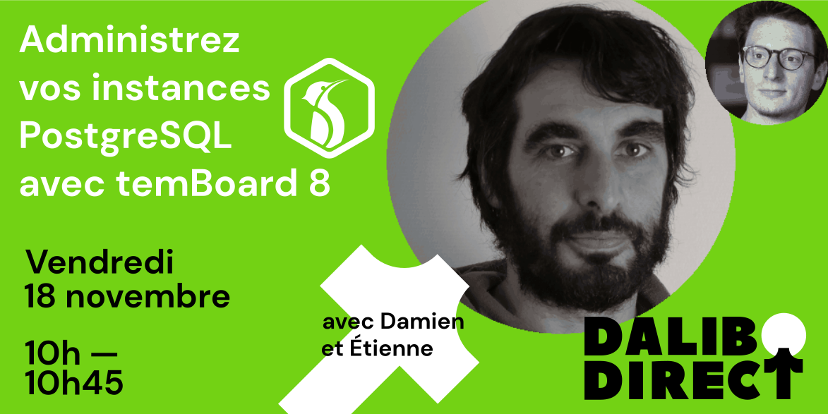 Avis aux #DBA : le #logicielLibre #temBoard permet de centraliser la supervision et l’administration d’un parc d’instances #PostgreSQL. @daamien et @bersace animeront un #webinaire le 18 novembre, inscrivez-vous ! => https://dali.bo/202210_dalibo_direct