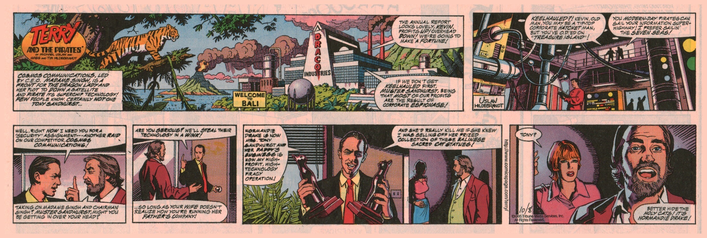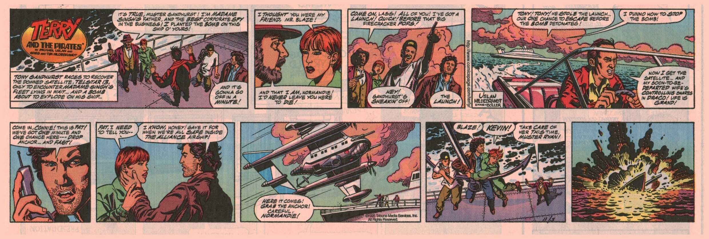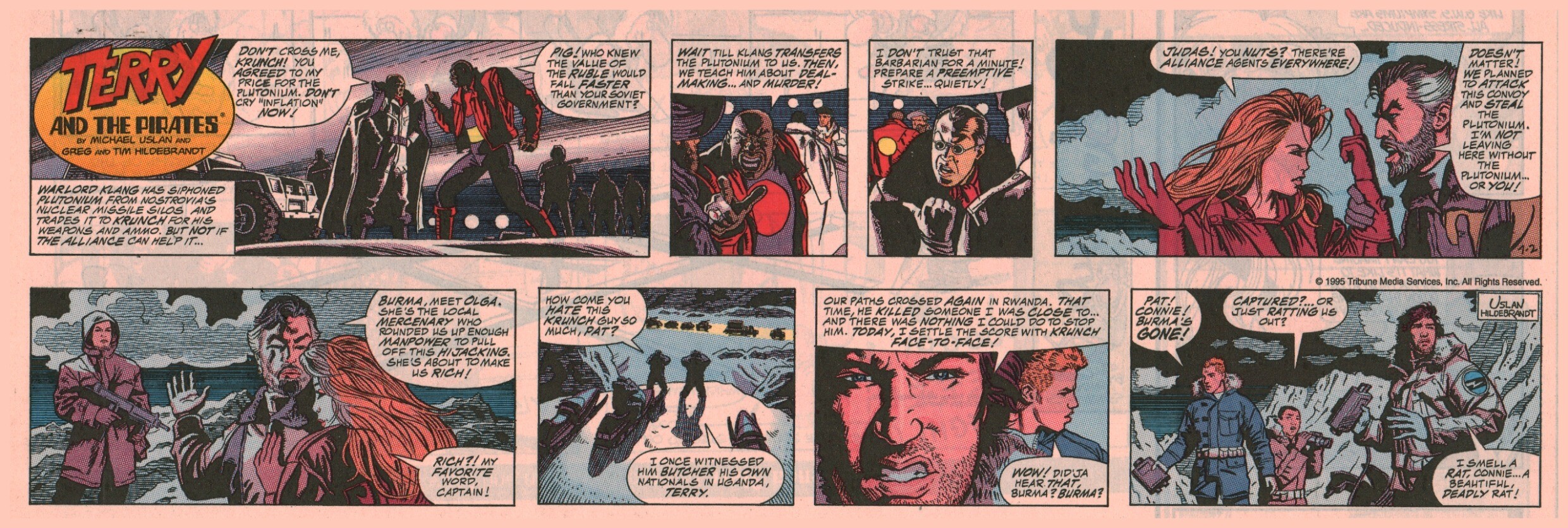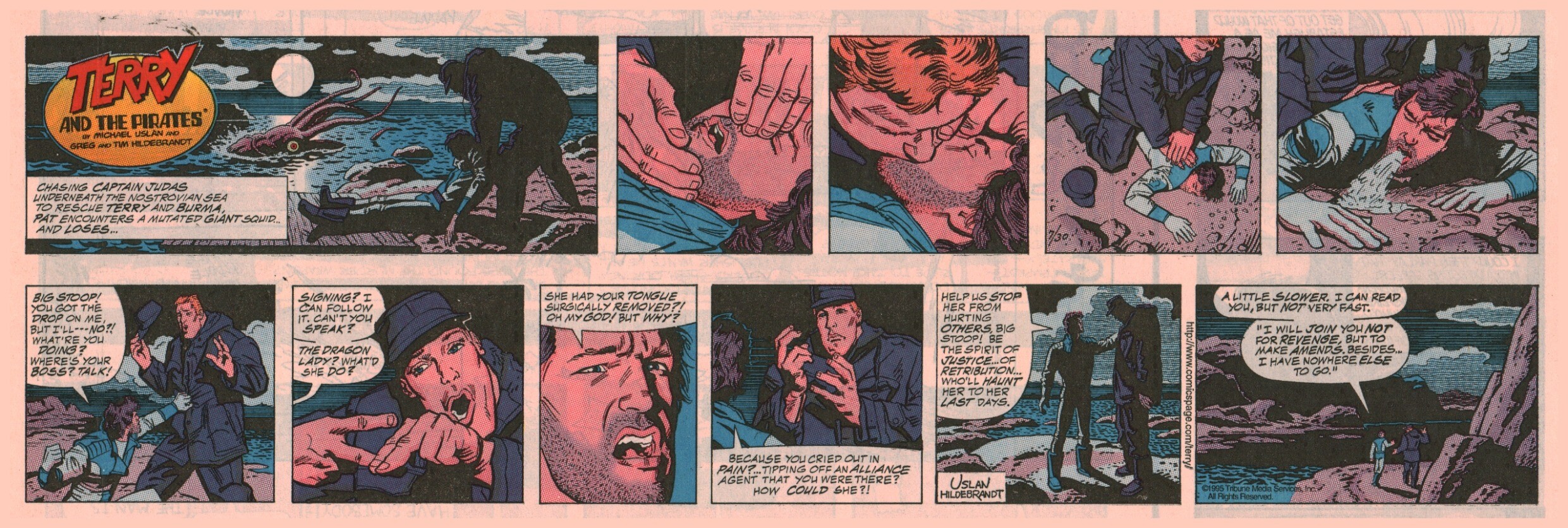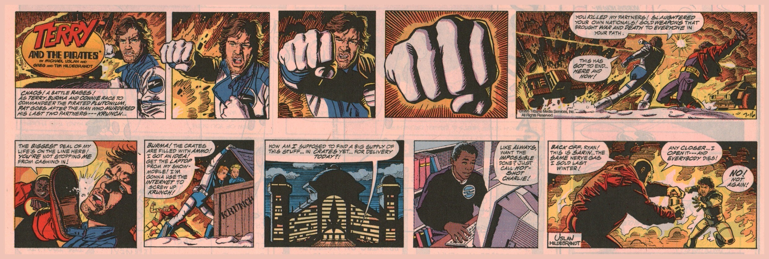 Pat has it out with Krunch while Terry "uses the internet" to foil the villain (with email it's 1995 after all).I wish I had the dailies for Terry but the clunky reading of the Sundays is made up for by the gorgeous Hildebrandt brothers artwork. From Pat's cinematic punch to the raging giant radioactive squid!