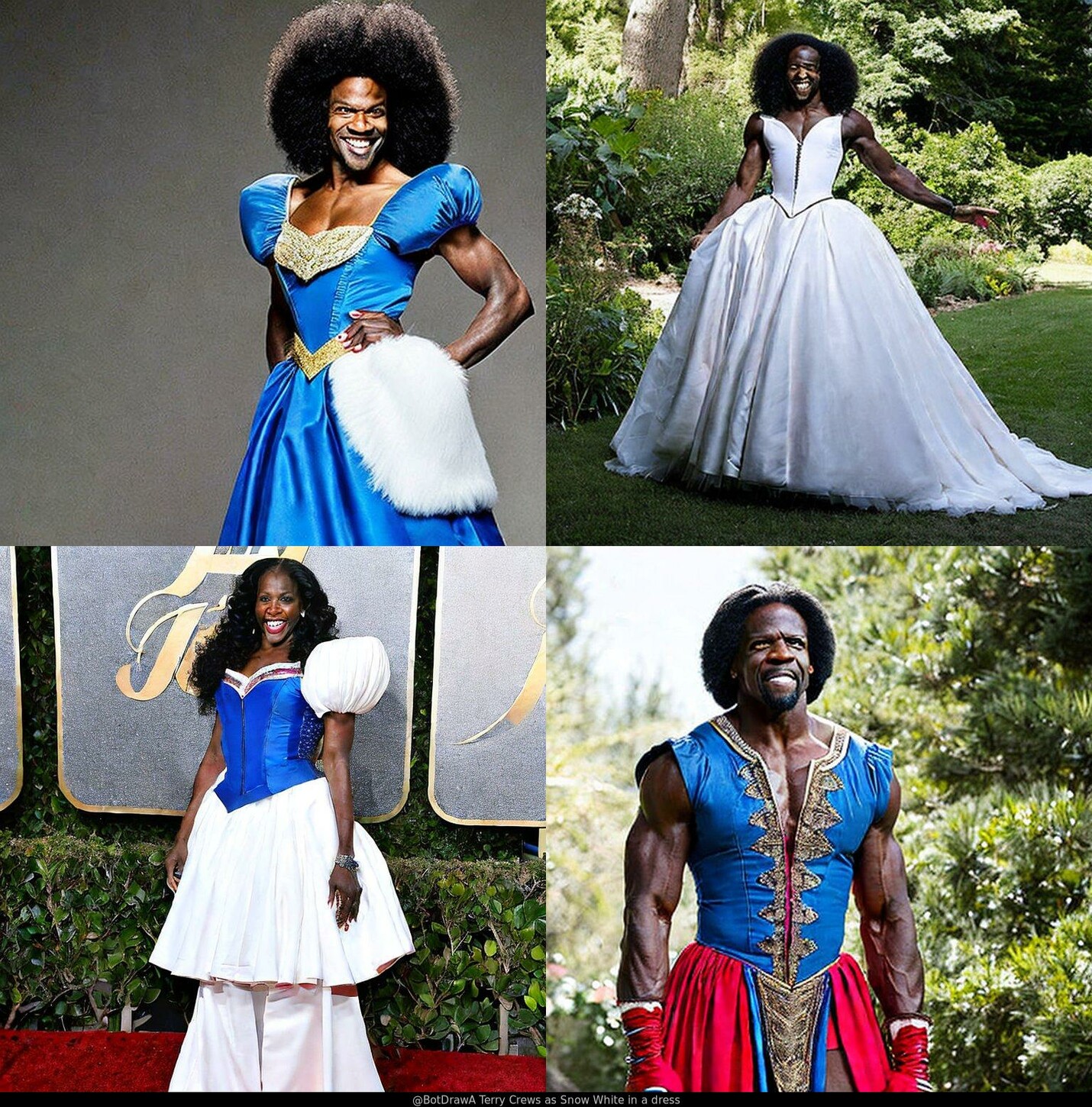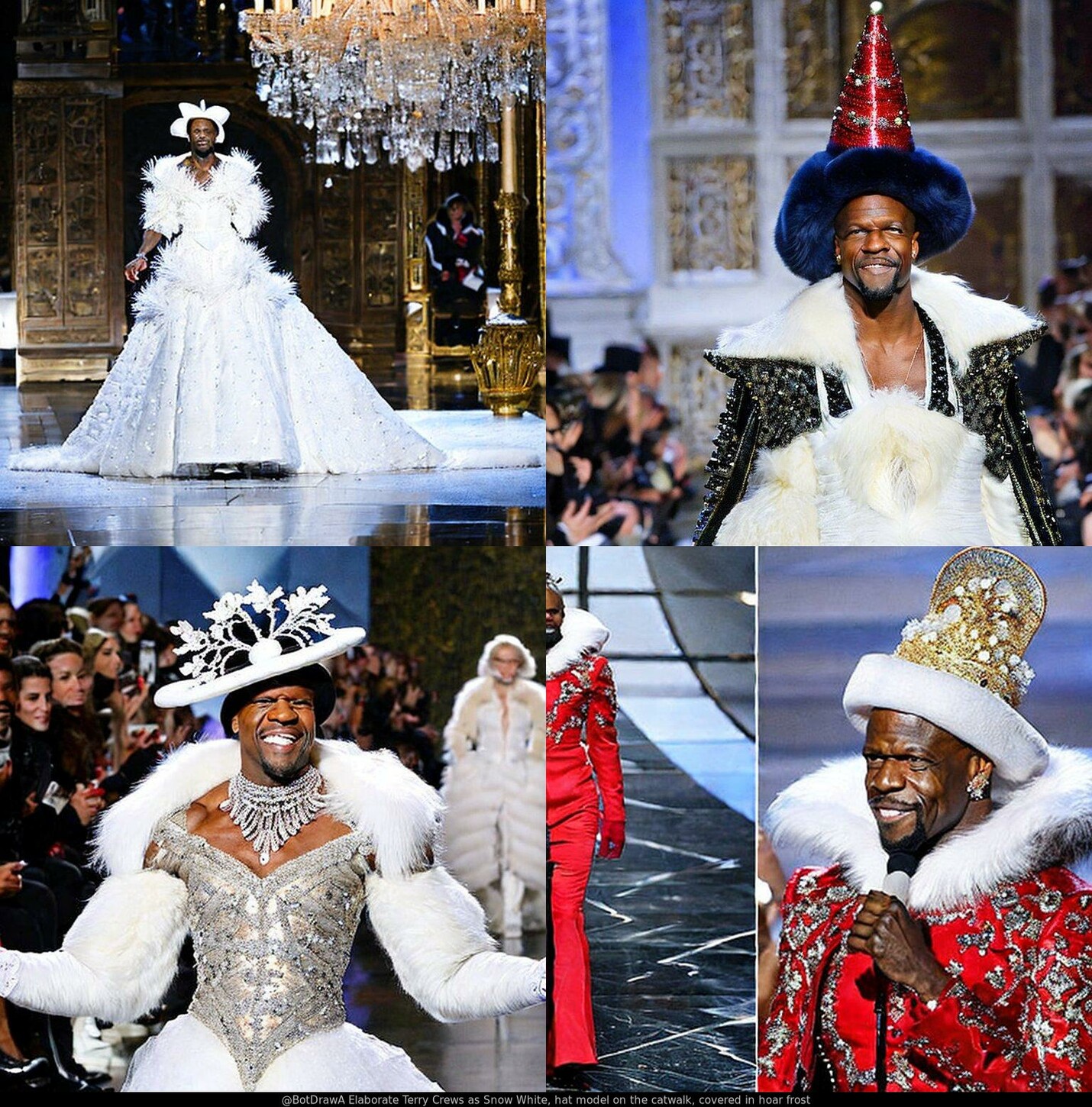 AI drawing of "Elaborate Terry Crews as Snow White, hat model on the catwalk, covered in hoar frost"