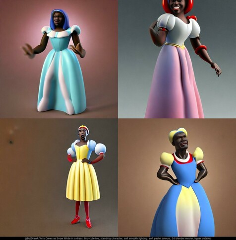 AI drawing of "Terry Crews as Snow White in a dress, tiny cute toy, standing character, soft smooth lighting, soft pastel colours, 3d blender render, hyper detailed"