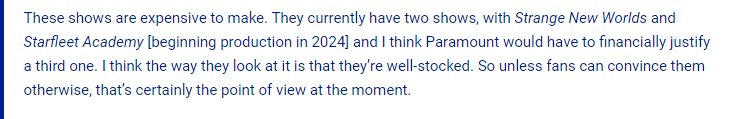 Though as fans we should never feel entitled to anything, this is especially maddening considering all the "weekly new Trek year-round" talk from CBS before the Paramount merger. Media and streaming consolidation is killing entertainment. #Picard #StarTrekLegacy #Paramount #TerryMatalas #Kurtzman