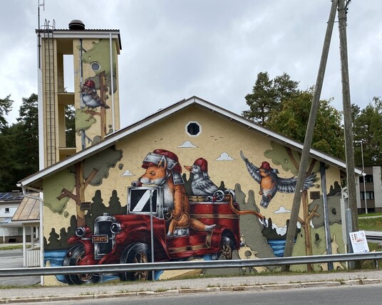 Mökkimme on tässä #Tervo ja #Vesanto rajalla, asioin yleensä Tervossa. Siellä pienen kylän ihmiset ottaneet oikein sydämen asiaksi viihtyisän ja visuaalisesti jännittävän kyläkuvan luomisen. Viimeisimpänä tempauksena paloaseman seinämaalaukset.