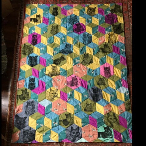 I finished the cat quilt for the 9yo! Swipe through for detail shots. Tumbling blocks with a random collection of interspersed hexagons with my linocut cat prints.