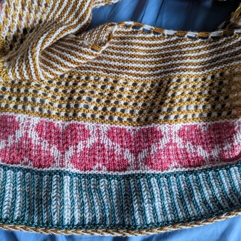 I thought this shawl was a pretty fun design with all the different stitches/textures but I didn't love it in the two colours it was designed for. So I went with bunch of minis/leftovers plus a contrast colour and I love it. Made it last year around this time and it's still in rotation when it's cold.