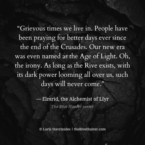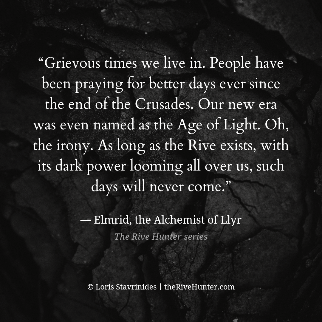 “Grievous times we live in. People have been praying for better days ever since the end of the Crusades. Our new era was even named as the Age of Light. Oh, the irony. As long as the Rive exists, with its dark power looming all over us, such days will never come.”