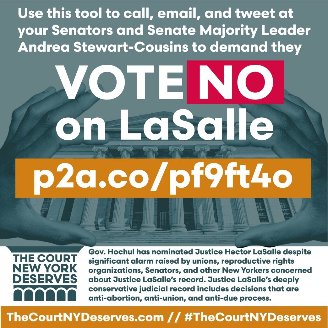 TAKE ACTION: Email your state senator to oppose the nomination of conservative chief judge nominee LaSalle. We cannot allow an anti-choice & anti-union candidate to be elevated to the highest judicial office in NY. #TheCourtNYDeserves