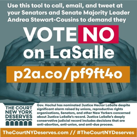 Urge your NY state Senator to reject Gov. Hochul’s nomination of Hector LaSalle for Chief Judge. He is anti-abortion, anti-union, and anti-due process — and he is not right for #TheCourtNYDeserves.
