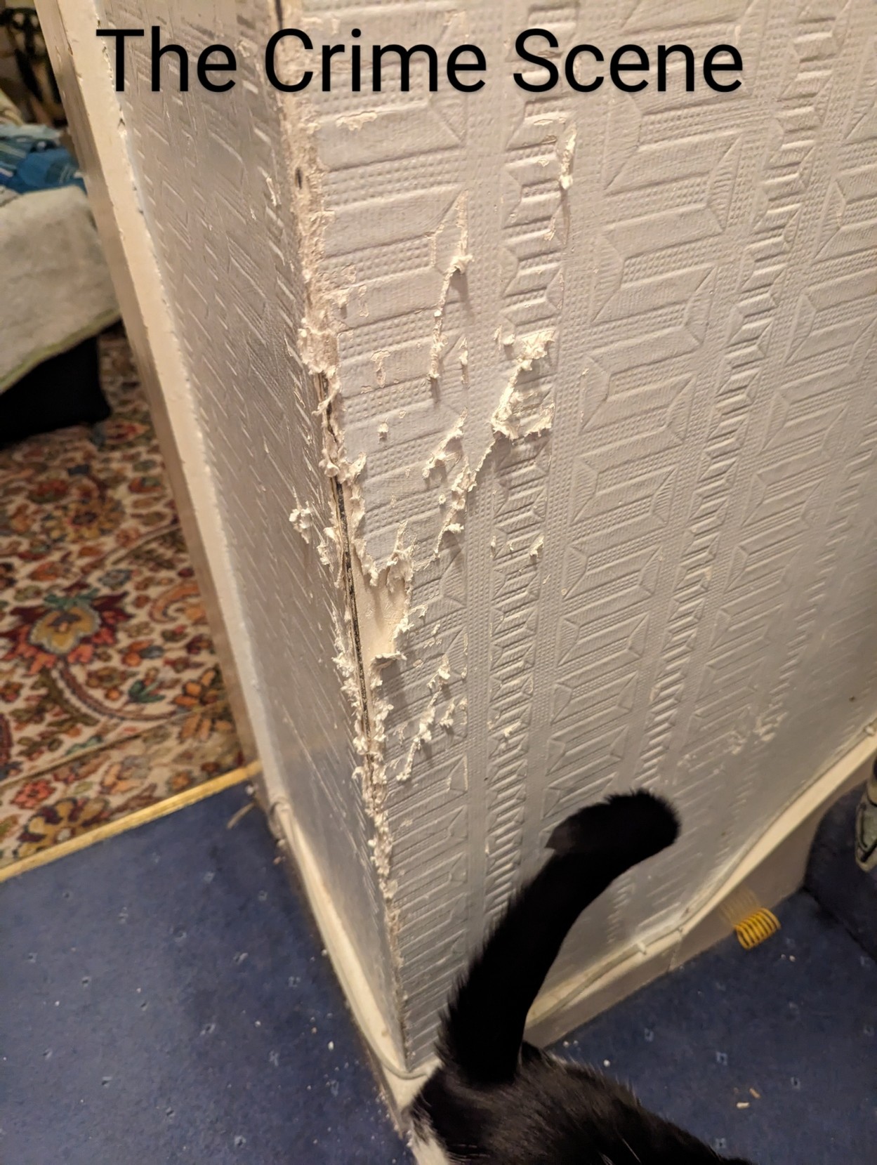 Which of our three Owners was responsible for utterly murdering the wallpaper this morning? Spoiler alert - a black and white tail can be seen retreating from the area ... #Cats #CatsOfMastodon #TheDestroyer