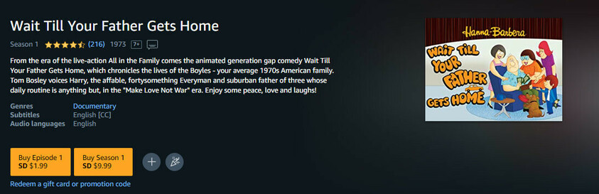 The 24 episodes of season 1 of Hanna Barbera's WAIT TILL YOUR FATHER GETS HOME (1972-1974) is now available on Prime Video. It was previously released on DVD in 2007.