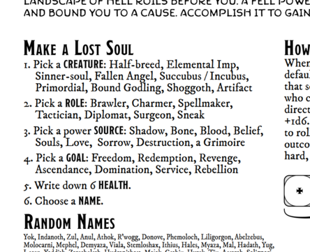 Taking some time to work on another short side project called #TheLostSoulBlues. It's a short game in the vein of Lasers & Feelings, set in Hell, where your PCs are bound to fulfill a mission for a demon lord in exchange for freedom. It goes about how you'd expect. More updates and beta on that soon on #VEGI