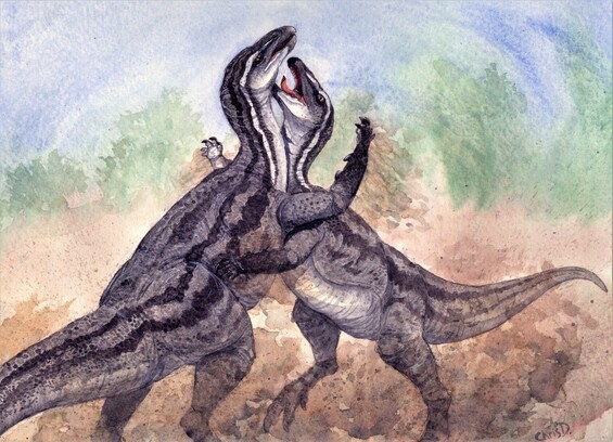 First post! Here is a #watercolor I did for @Boydpaleo’s recent talk about finding bony spurs on the forearms of some mature #Thescelosaurus! We already know they had bony plates on their ribs so makes sense if they were hitting each other there, using the plates as defense. #dinosaur #paleoart