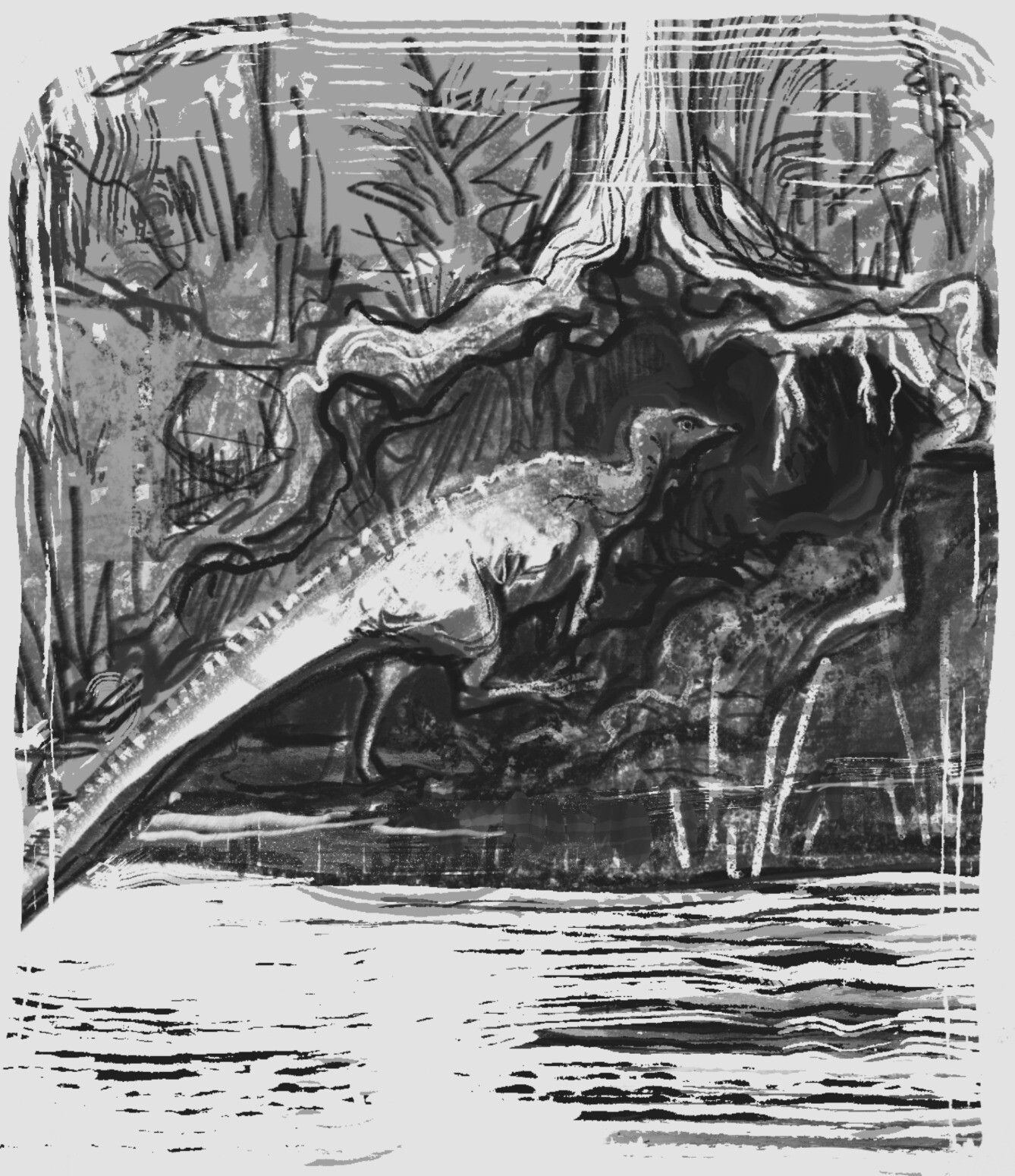 selected a dinosaur from the end of the Late Cretaceous that fit the reported size and by having “bony studs” (which I don’t think is true?). Despite having “few clues” Hall invents a #SpeculativeZoology scenario where #Thescelosaurus survives the (asteroid-free, hmm…) Cretaceous and becomes a snorkel-bearing aquatic species primarily dwelling in the Gulf Stream and Bahamas, going to estuaries only to lay eggs. Oh, and the pink color is derived from carotenoids.