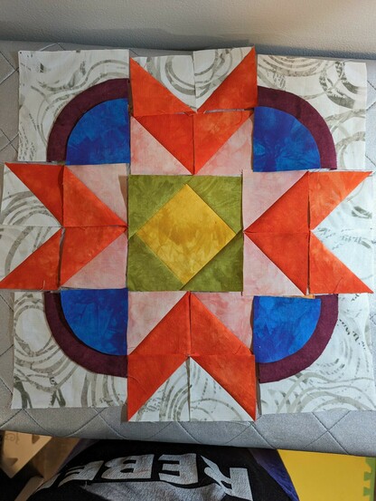 Last night, I made some modifications to block 2 for my #SaraFielkeBOM #thesecretgardenbom I changed the red to a peachy color and changed the dark orange to a vibrant blue. It pops better now!