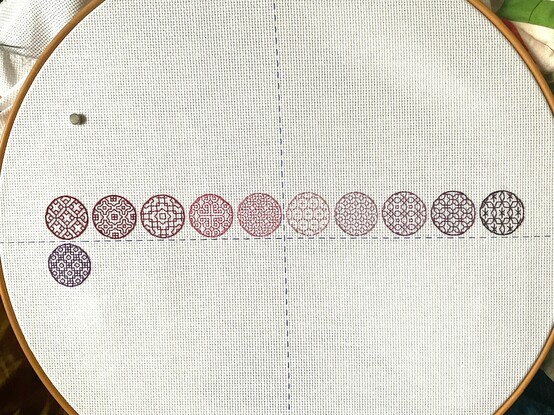#Blackwork! I have 11 of the 100 Circles Sampler done, and a good start on the Botanical Stitch-Along. Tomorrow I’ll be able to fill in the first hexagon! (She releases one hex per week, and only one is up so far)