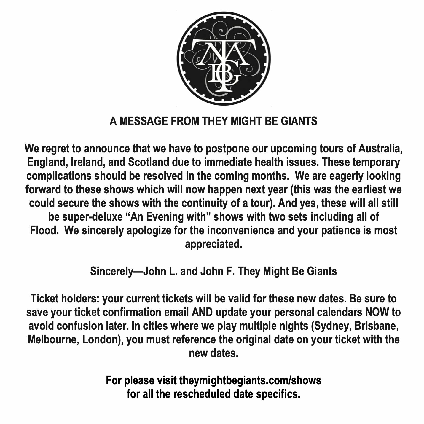 Oh nein! Ich wollte im November mit Freunden auf ein Konzert von #TheyMightBeGiants in #Manchester. Heute morgen haben sie alle weiteren Konzerte in Europa und Australien aus gesundheitlichen Gründen abgesagt 😢