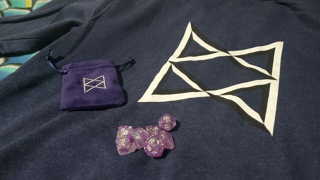 Finally got my #thezonecast #bureauofbalance dice and hoodie! On Yule! Best day ever! @EvewynnWorkshop@twitter.com, the dice are gorgeous! (I absolutely held every one of them up to the light and squealed over them)