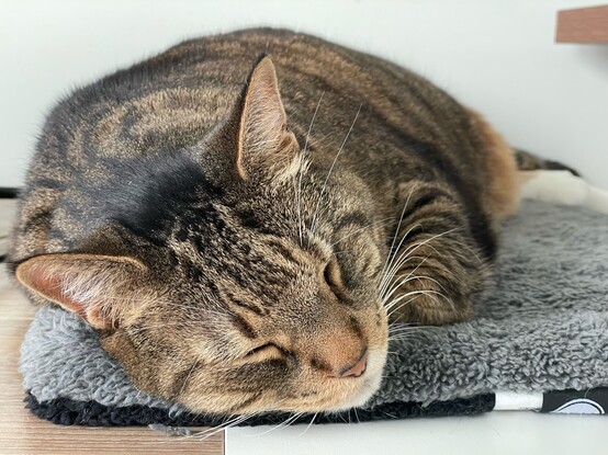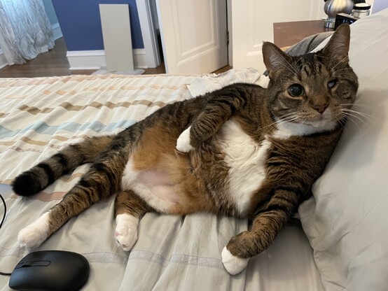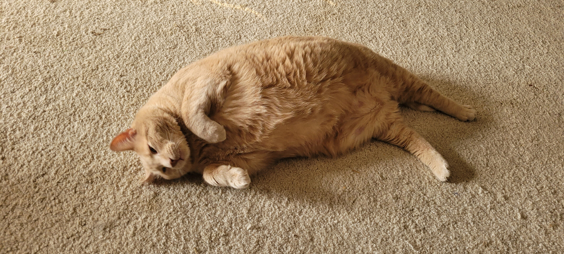 Taking care of an XXL cat definitely has some extra maintenance range, but for me it has always been beyond worth it. Fig Mewton (the one-eyed tabby in my other pics) was also 10 years old when we adopted him. His “only 19 lbs” seems light in comparison.