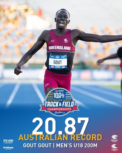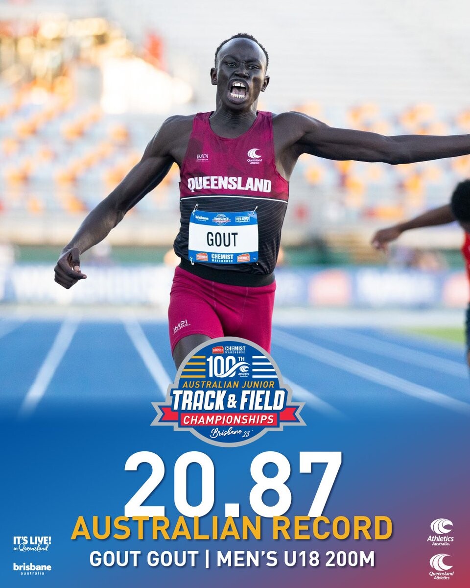 Ipswich teen Gout Gout has smashed the Australian Under 18 200m record, clocking at 20.87 (-0.1) at the Australian Junior Championships.