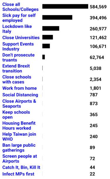#ThrowbackThursday - 3 years ago, March 16th 2020, I was histogramming the petitions on the UK Parliament website - the public were ahead of the government, calling to close schools, pay the self employed sick pay and Lockdown like Italy