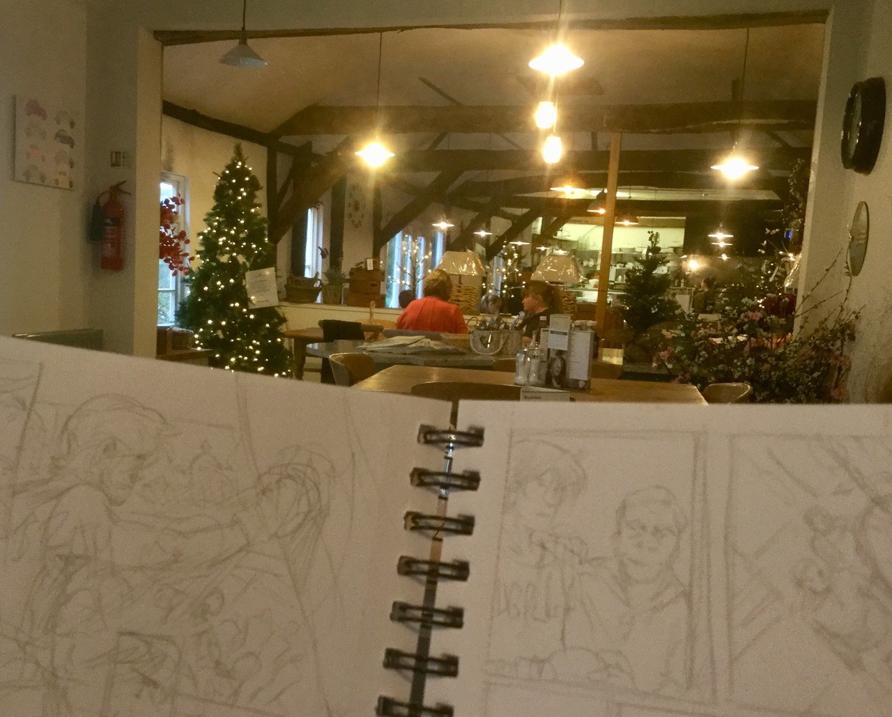 Sat working in my local cafe. I went for the sketch pad in the end, so am pencilling BREAKS pages. But it’s super Christmassy in here! Early, but I don’t mind.