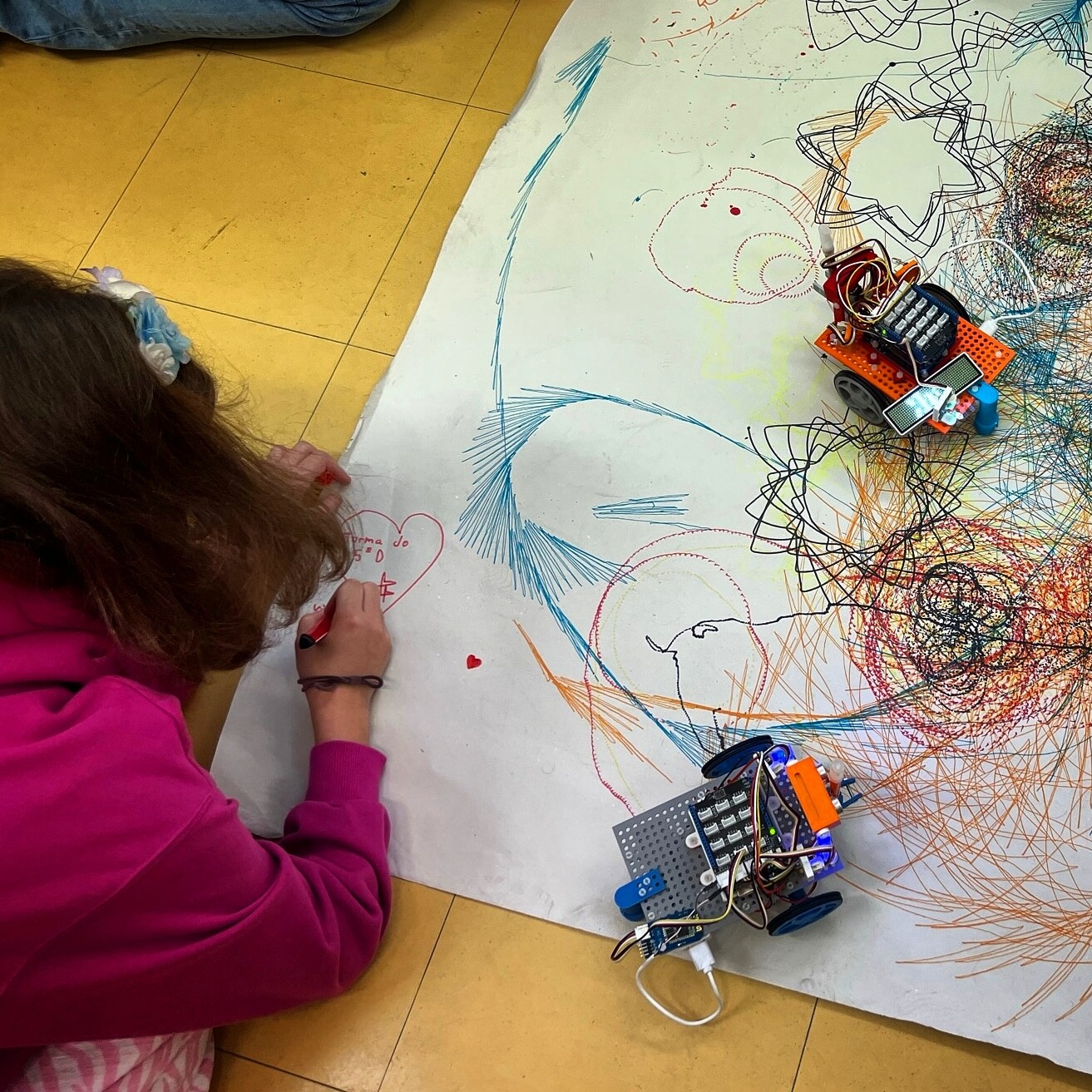 "Usei uma folha de matemática para ajudar", diz-me a aluna, "e só me falta programar o céu..." Ah, tenho de lhe mostrar os for loops, pensei. Os charms a encantar as alunas do quinto ano no clube de robótica. #coding #ticem3d #aevendadopinheiro #imagilabs