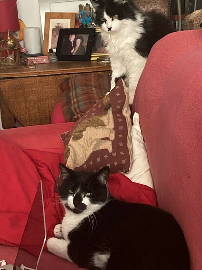 #CATURDAY...Like bully #Putin, when Major Mog & Territory Tsar, #Ting cat, is surrounded by battle-axe/battle-ready Tsu cat (with her menopausal anger issues) and youthful minxy neighbour cat, Leia who is camouflaged and waiting to pounce, Ting reluctantly removes troops from #Kherson. #Pusskinland fears for what may come next in the daily #FelineWars... #mastondon.ie #mastodoinie