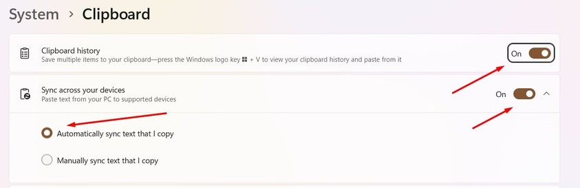 #Clipboard - Win + I (settings) pa aktivirajte Clipboard history i sync sa drugim računarima (ako radite na više njih)