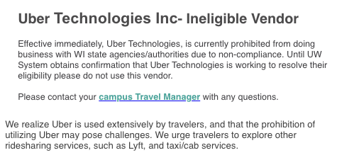 #Uber is no longer a qualified vendor for state agencies in #Wisconsin. #Lyft is not affected.