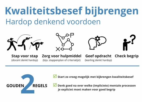 Kwaliteitsbesef bijbrengen door hardop denkend voor te doen.