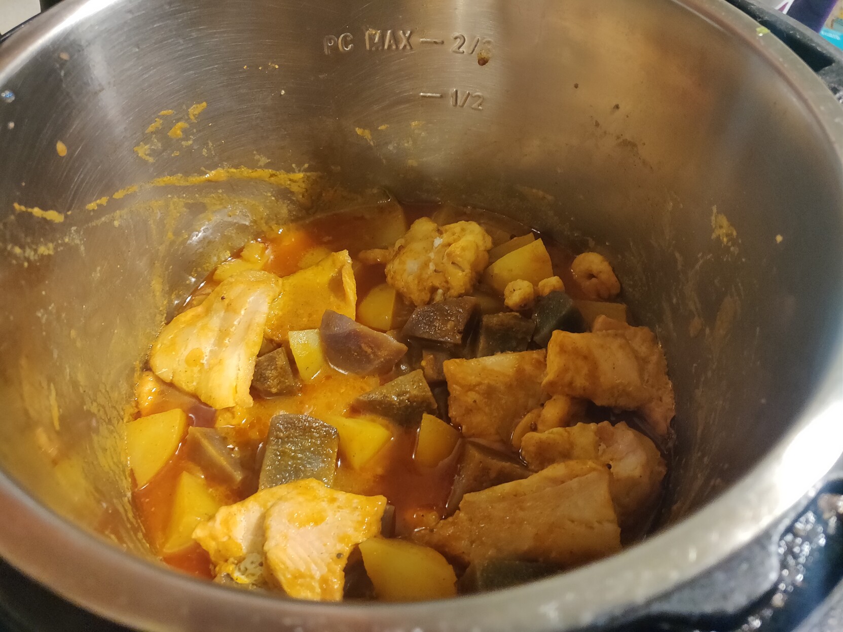 Diced potato (including blue ones), fish pie mix (frozen), half a jar of curry sauce from excellent Mr Vikkis, #instantpot pressure cooked at low pressure for 1 minute and naturally released.
