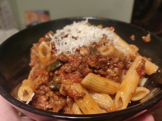 Cagette and onion sauteed for ten mins, added garlic tomatoes, red wine, black pepper and oregano, pressure cook for 1 minute, let the pressure off naturally.