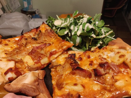 Tonight's tea: pizza to infuriate almost everybody in a different way: pineapple, ham and kimchi. #tonightstea #pizza #kimchi