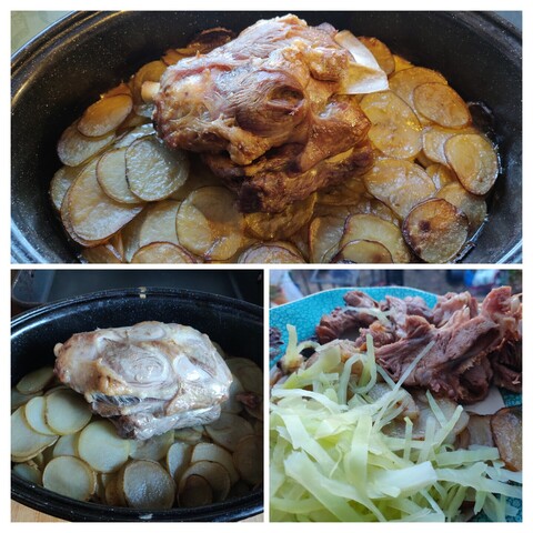 #TonightsTea: lamb shoulder roasted over sliced potatoes. Four ingredients (salt, potatoes,salt,oil) and served with fresh white cabbage and Mr Vikkis Black Garlic and J