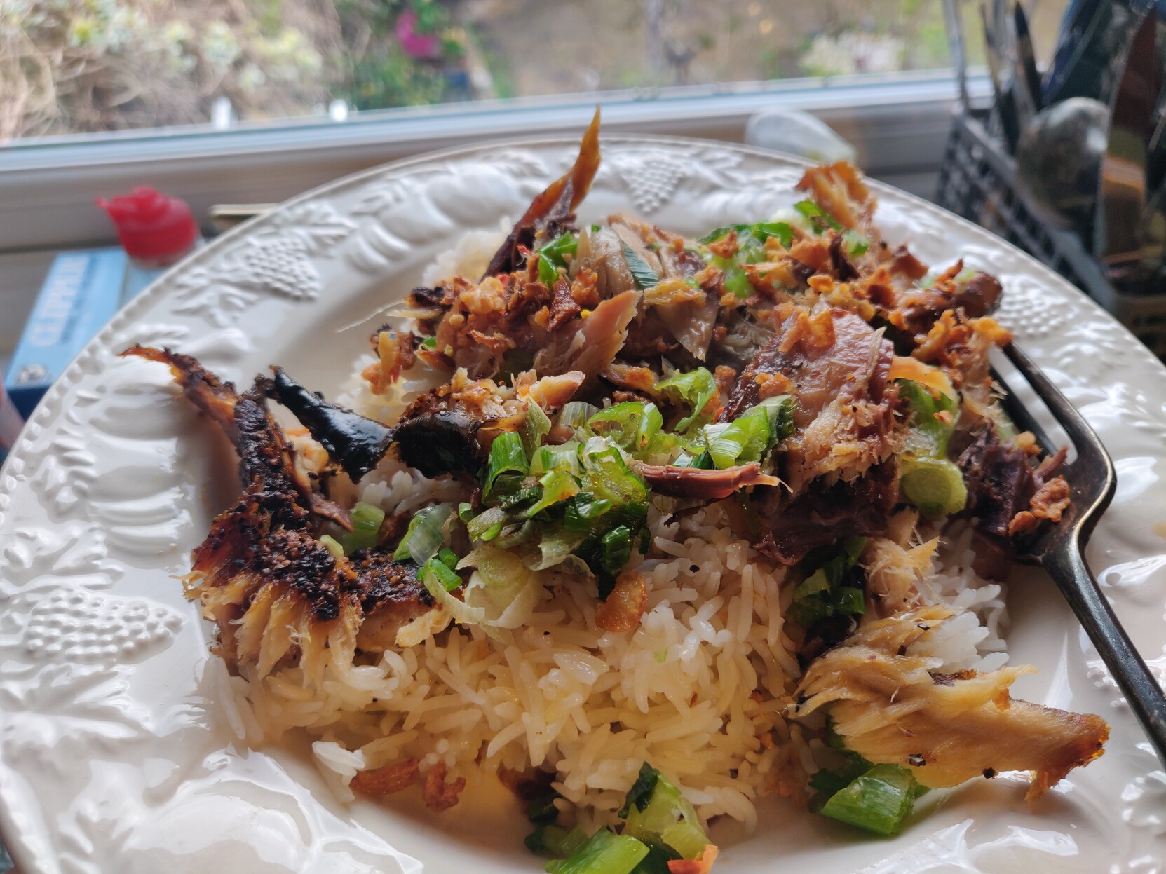 Hard grilled peppered smoked mackerel, with crispy friend onion, chilli flakes and spring onion. Topped with light soy and black vinegar.