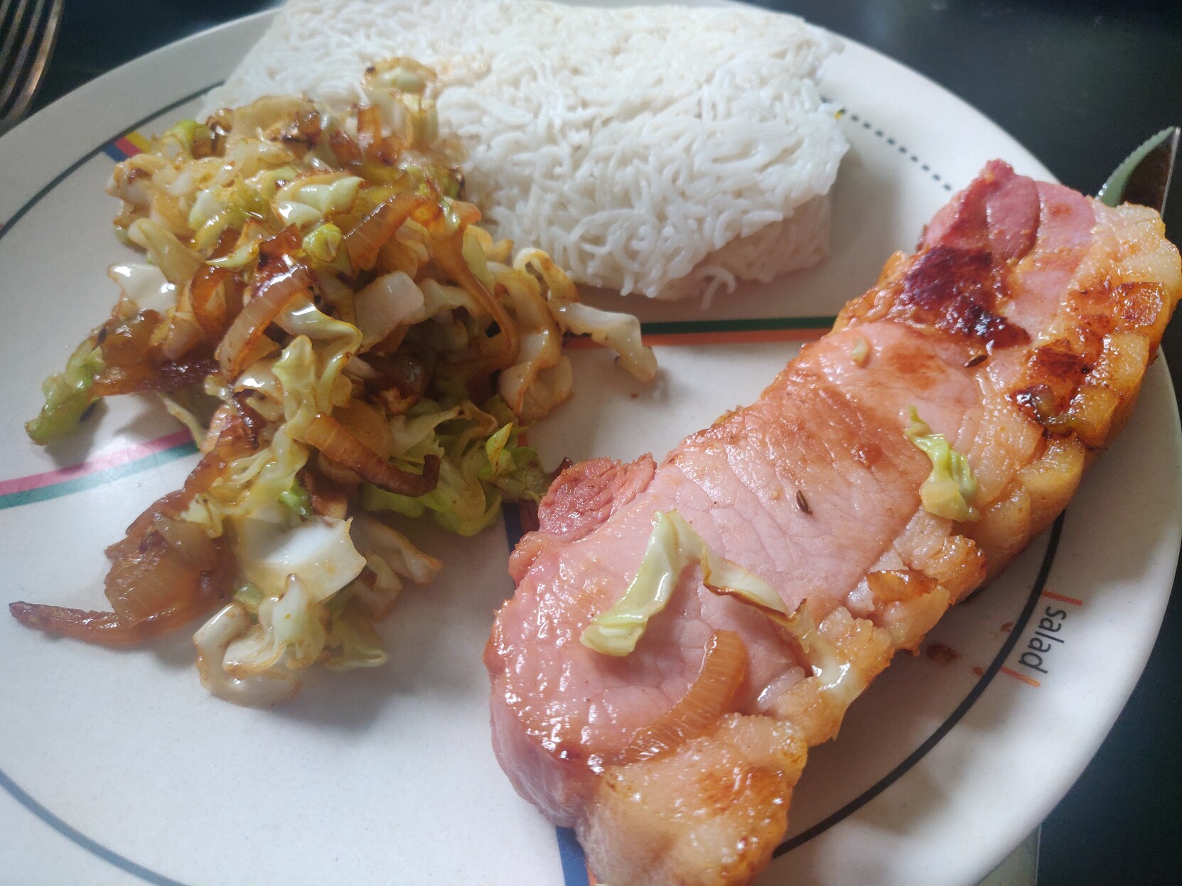 #tonightsTea bacon chop from g&s organics, cooked with onion and green cabbage, served in my case with rice. I added a pinch of caroway. Years ago I had pork, cabbage and caroway in Czechia and it was ace, so I thought I'd give it another go.