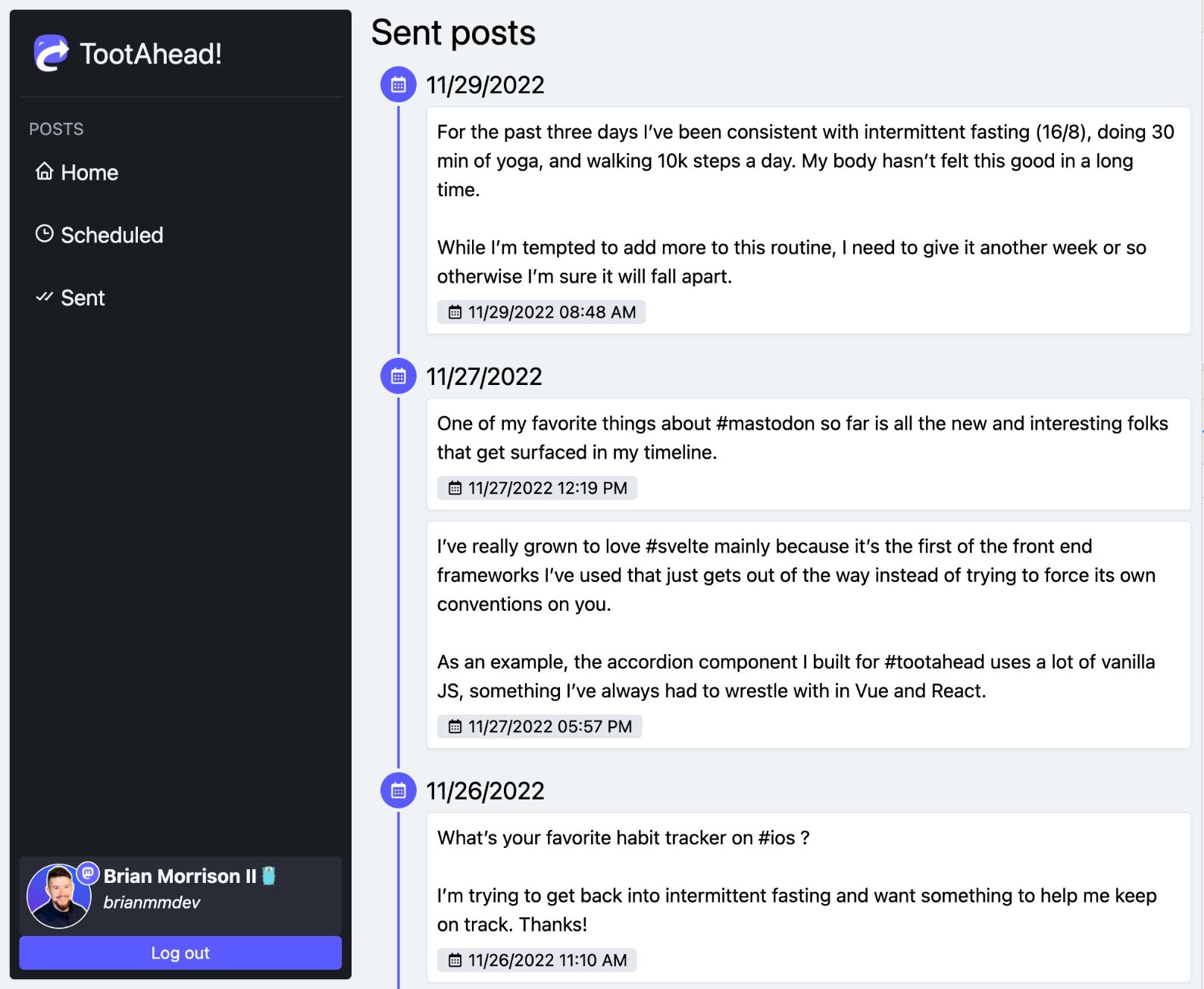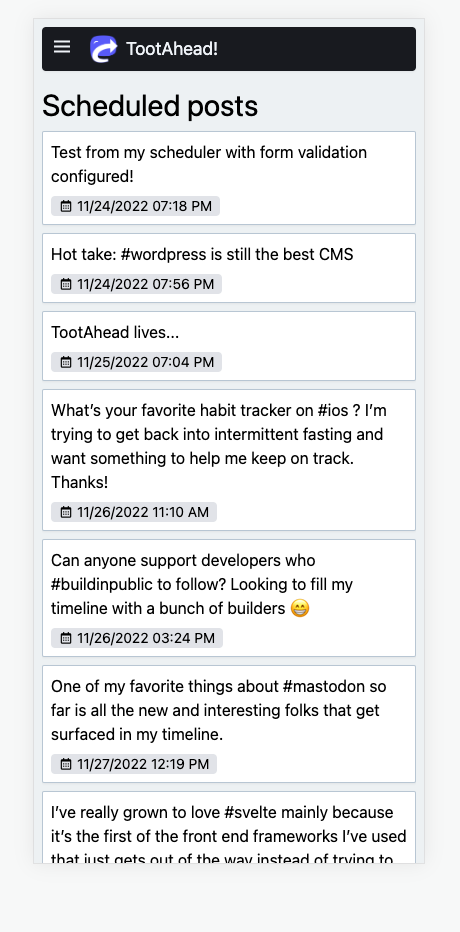 Made some decent progress on #tootahead today. Built the functionality to edit and delete scheduled posts, as well as view your history! I need to polish it a bit, but it should make it to prod tomorrow 😄
