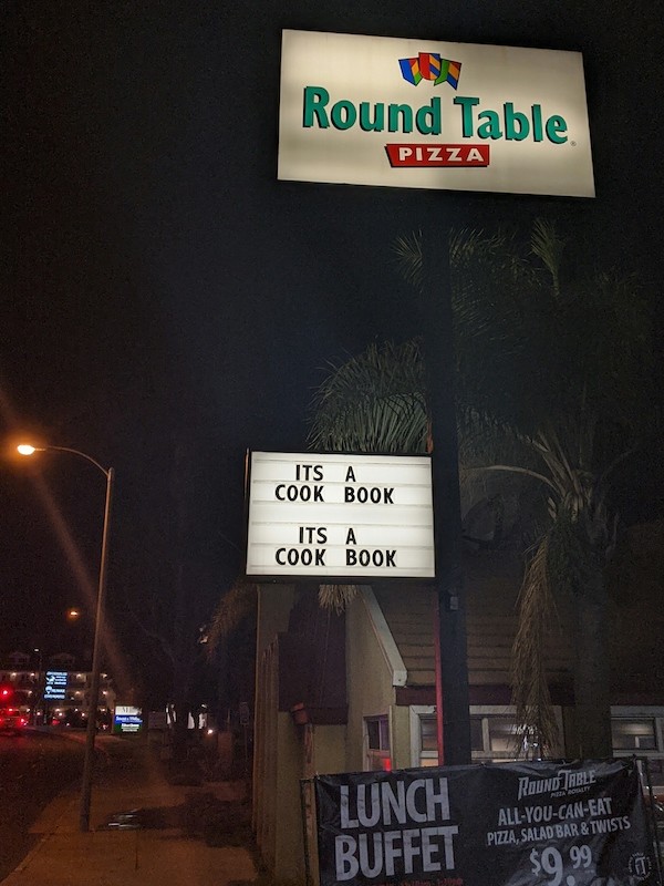 This pizza place often posts movie and TV quotes on its marquee, but sometimes their choices are a little…odd. #ToServeMan #WhatDoYouThinksInThePizzas