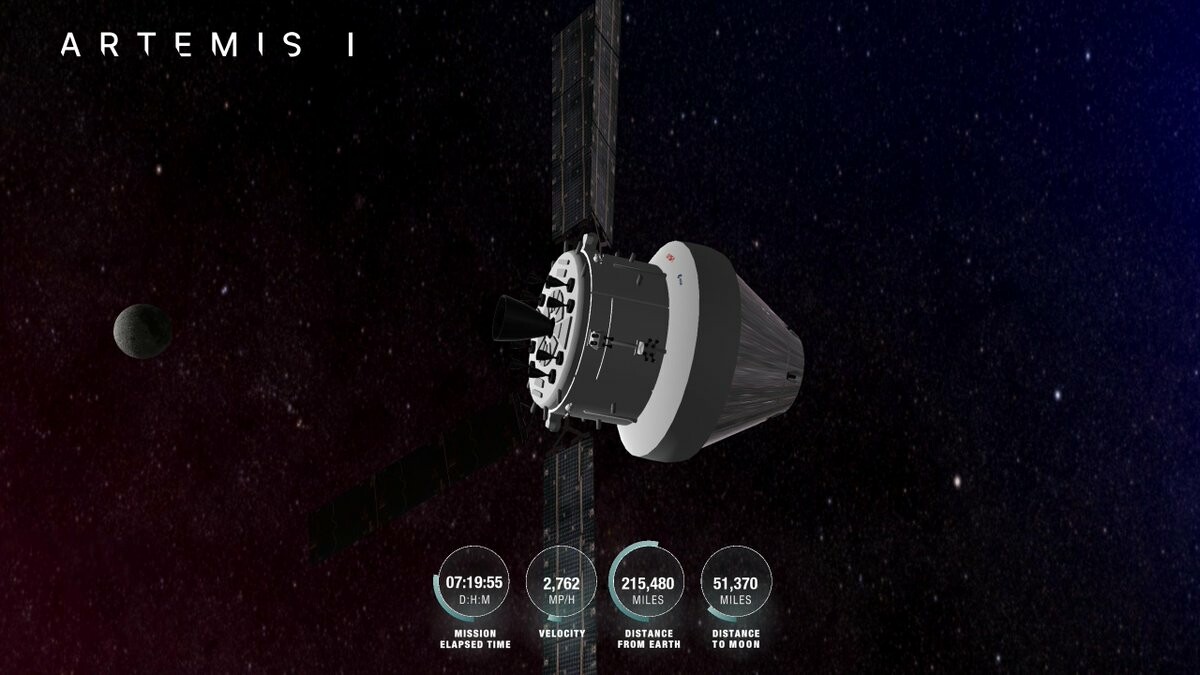 Orion is 215,480 miles from Earth, 51,370 miles from the Moon, cruising at 2,762 miles per hour.
