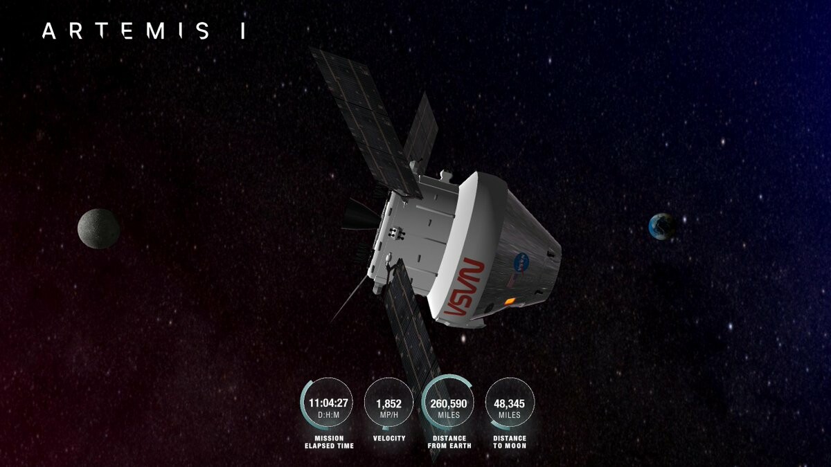 Orion is 260,590 miles from Earth, 48,345 miles from the Moon, cruising at 1,852 miles per hour.