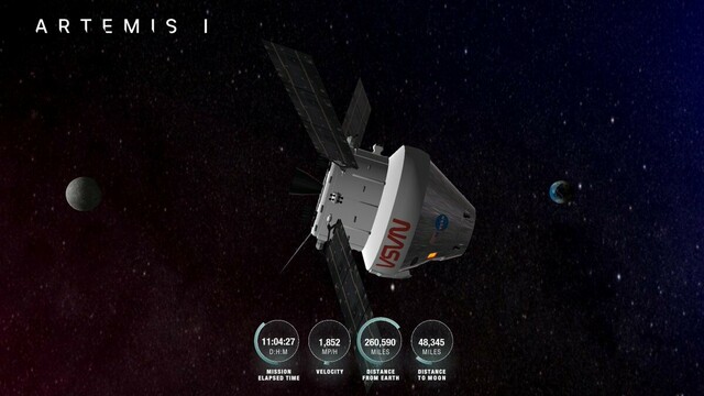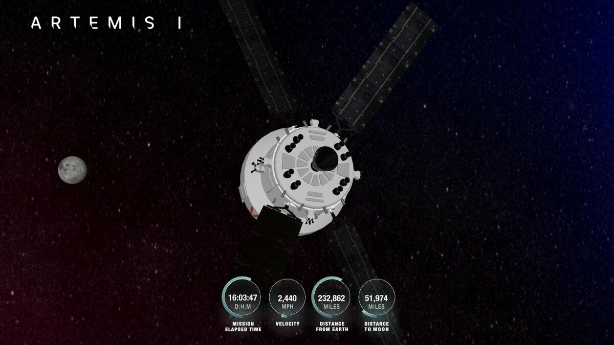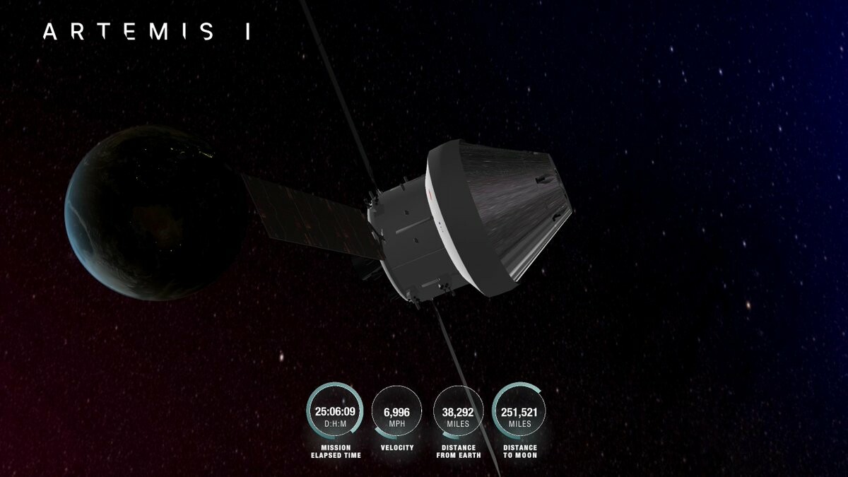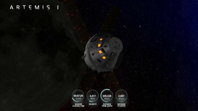 Orion is 226,538 miles from Earth, 2,607 miles from the Moon, cruising at 4,416 miles per hour.
