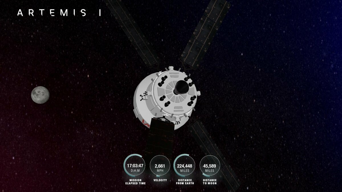 Orion is 224,448 mi from Earth, 45,589 mi from the Moon, cruising at 2,661 mph.