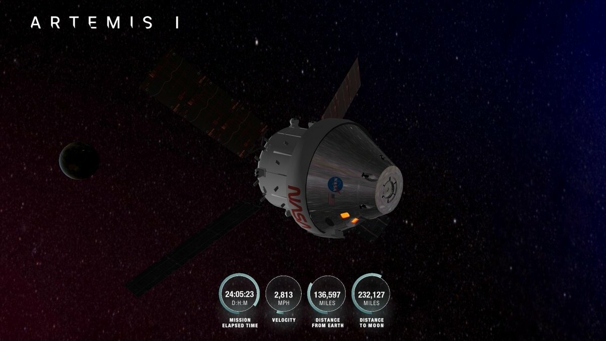 Orion is 136,597 mi from Earth, 232,127 mi from the Moon, cruising at 2,813 mph.