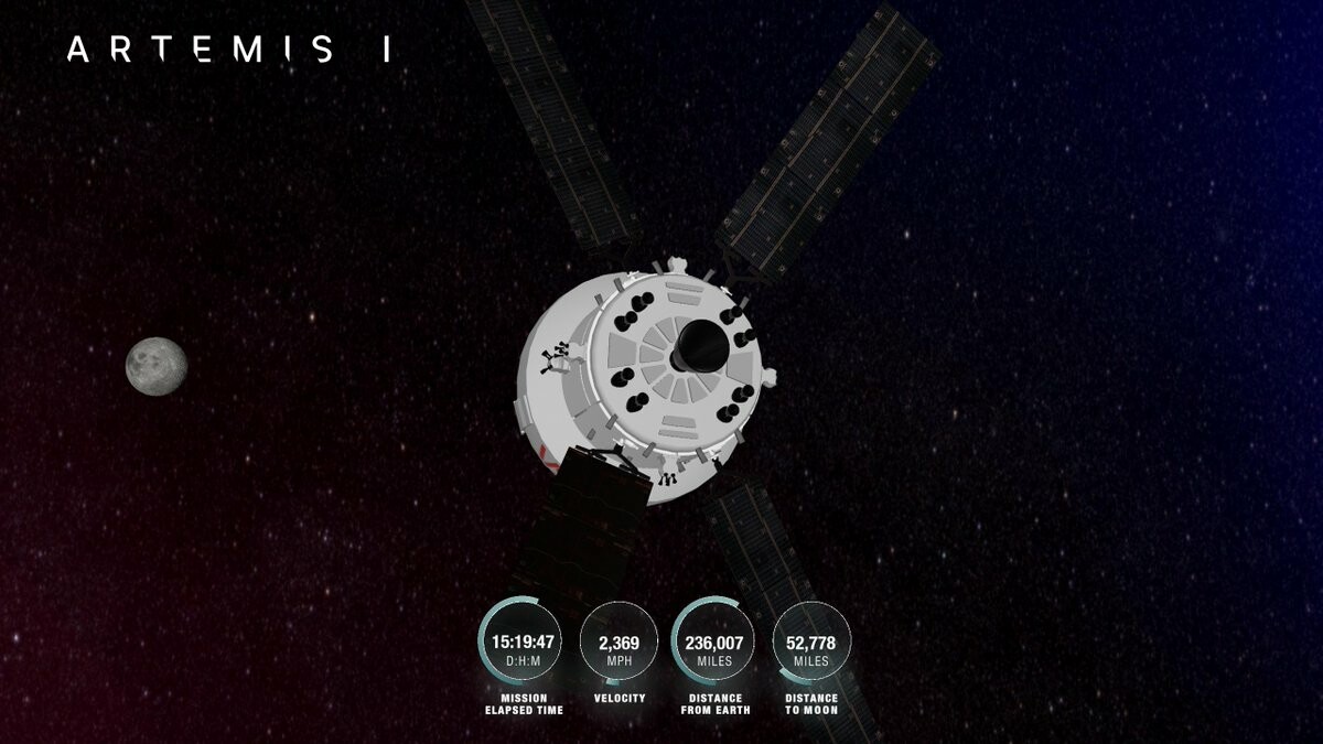 Orion is 236,007 mi from Earth, 52,778 mi from the Moon, cruising at 2,369 mph.