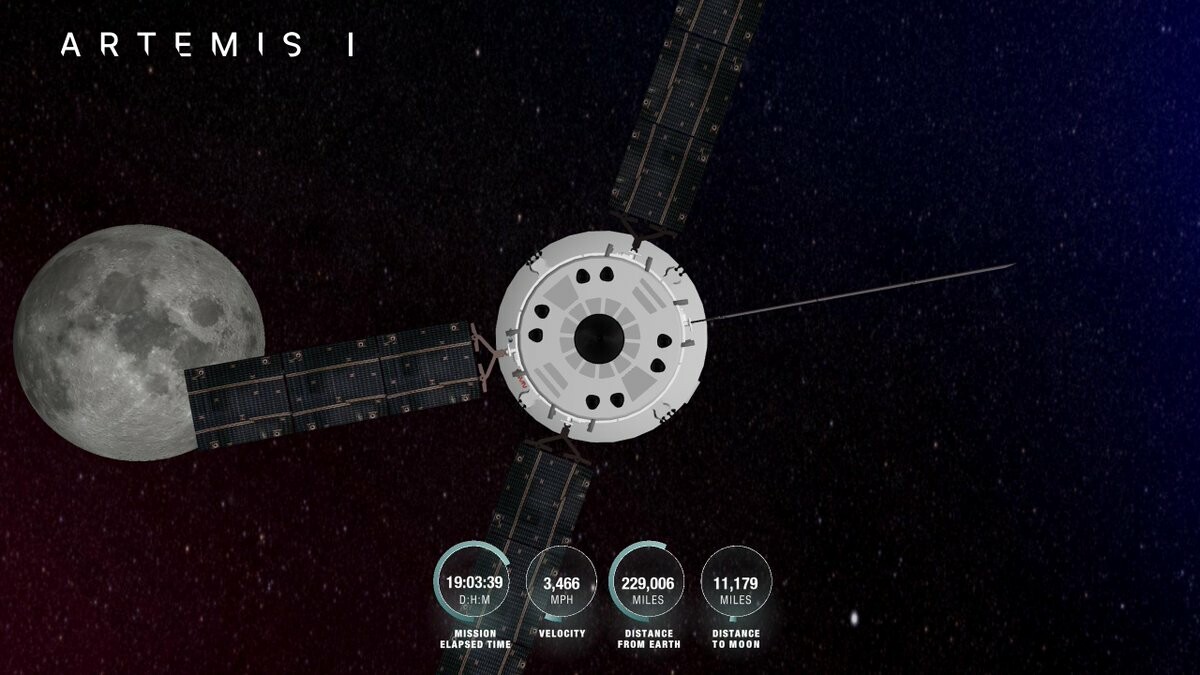 Orion is 229,006 mi from Earth, 11,178 mi from the Moon, cruising at 3,466 mph.